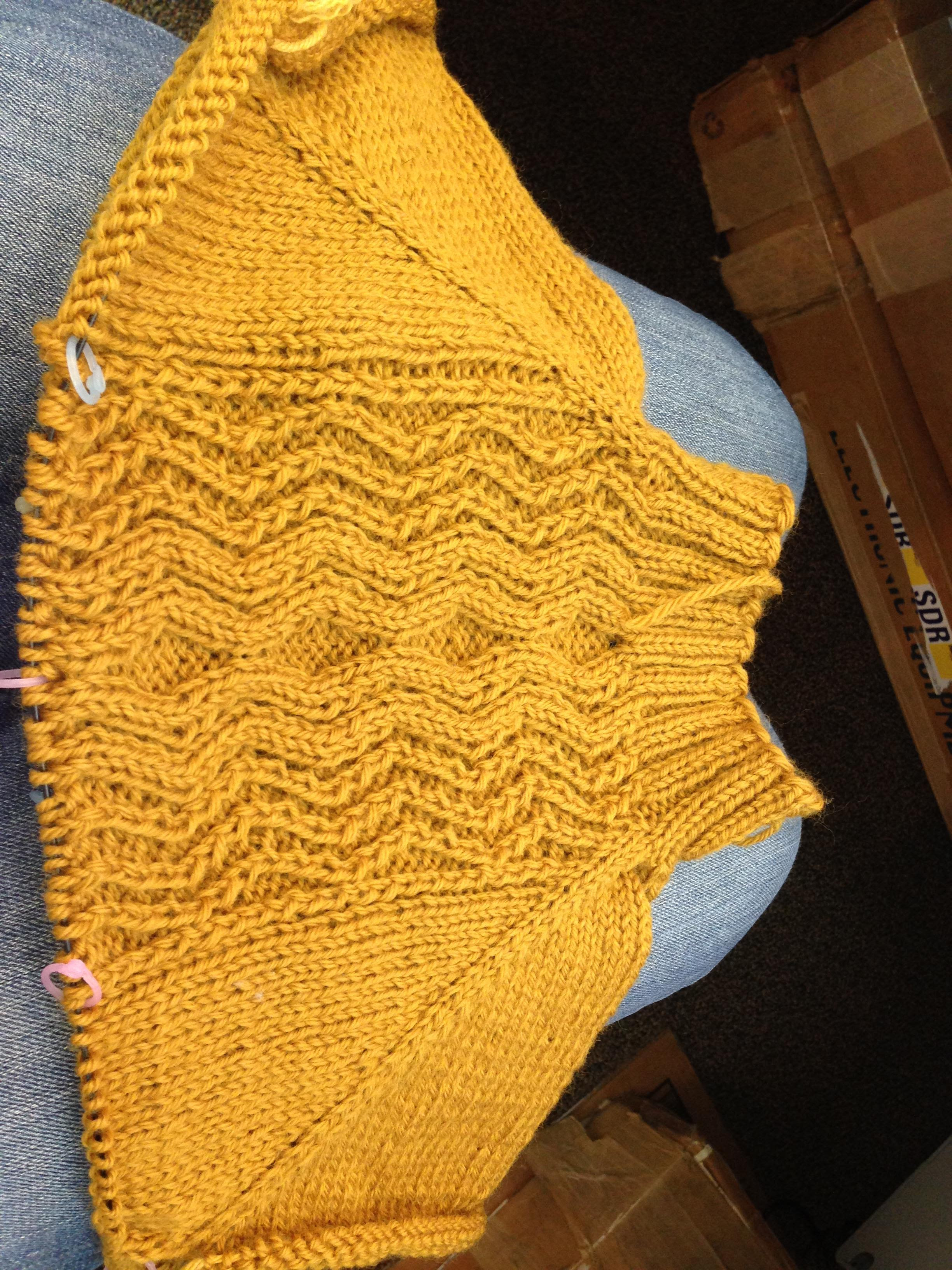 Smooth sailing from here. I just need to add about 12 inches in length, while decreasing for waist shaping, then increase for hips, knit the bottom rib, pump out two stockinette sleeves, then knit the two button bands and attach them, block and find buttons.